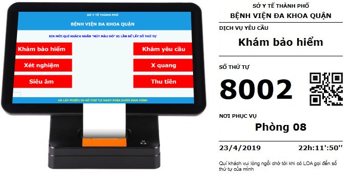 *Máy tính cảm ứng hoặc (máy tính PC + màn cảm ứng) + máy in lắp khu lễ tân/lối vào cho khách lấy số